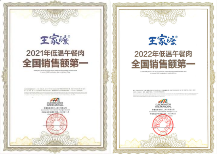 由欧睿信息咨询(上海)有限公司发布,王家渡低温午餐肉连续两年获得中国大陆地区调研2021年、2022年低温午餐肉全国销售额第一,这说明了王家渡品牌深受消费者喜爱,是名副其实的口碑品质双丰收!